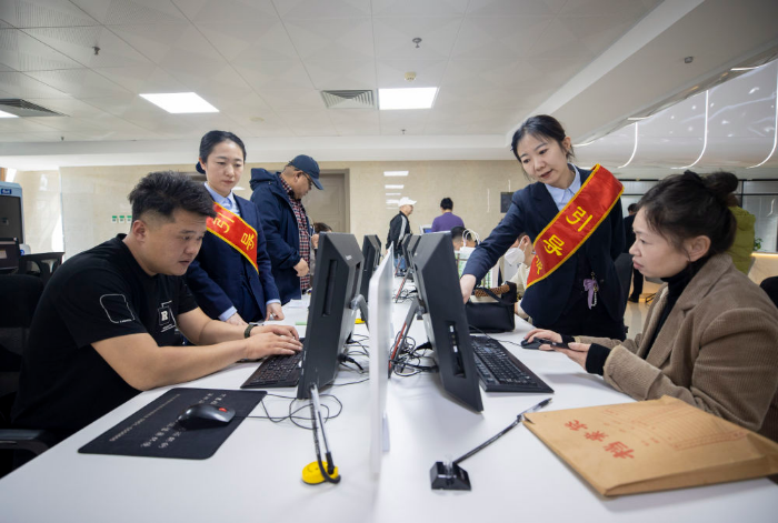 2025年3月21日,在银川市审批服务管理局企业服务大厅,工作人员引导办事人员使用“宁夏企业开办‘一网通办’服务平台”办理业务。新华社记者 杨植森 摄